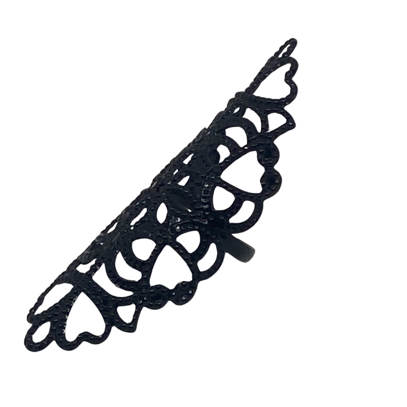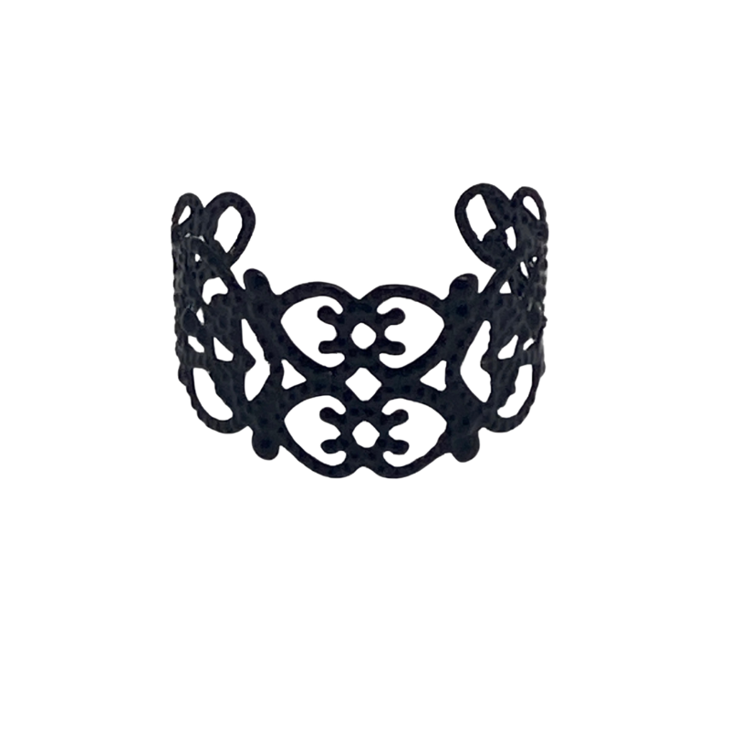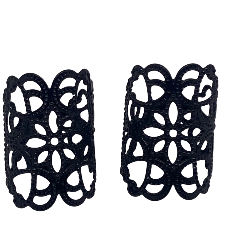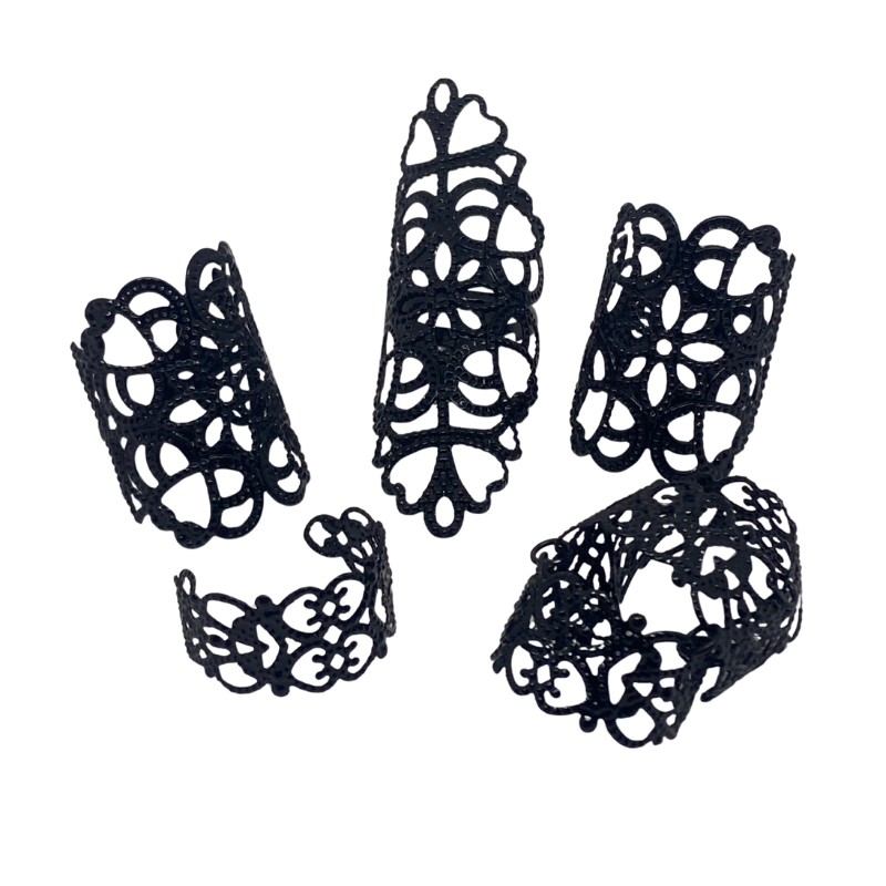 Add a touch of dark elegance to your look with the Black Hollow Flower Rings set. The set includes five rings, four of the rings are adjustable for a comfortable fit, while one ring is a fixed size K.