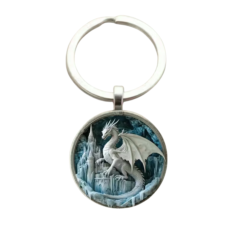 Rule the frosty realm with the White Dragon Keyring – a majestic wyrm sits atop a snow-capped castle, set in a serene winter wonderland. The circular element is 2.5 cm across, printed flat in 2D.